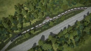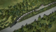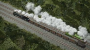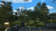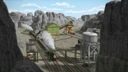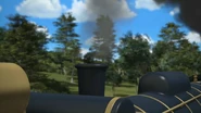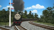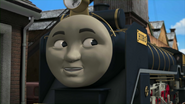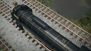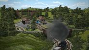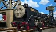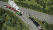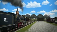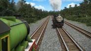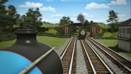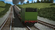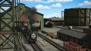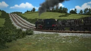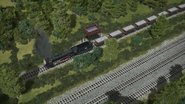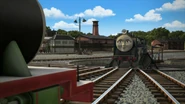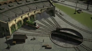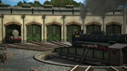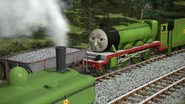- הירו והנרי יוצאים ממוסך הקיטור זה לצד זה, אולם קיימת רק מסילה אחת על משטח ההעברה שמחוץ למוסך.