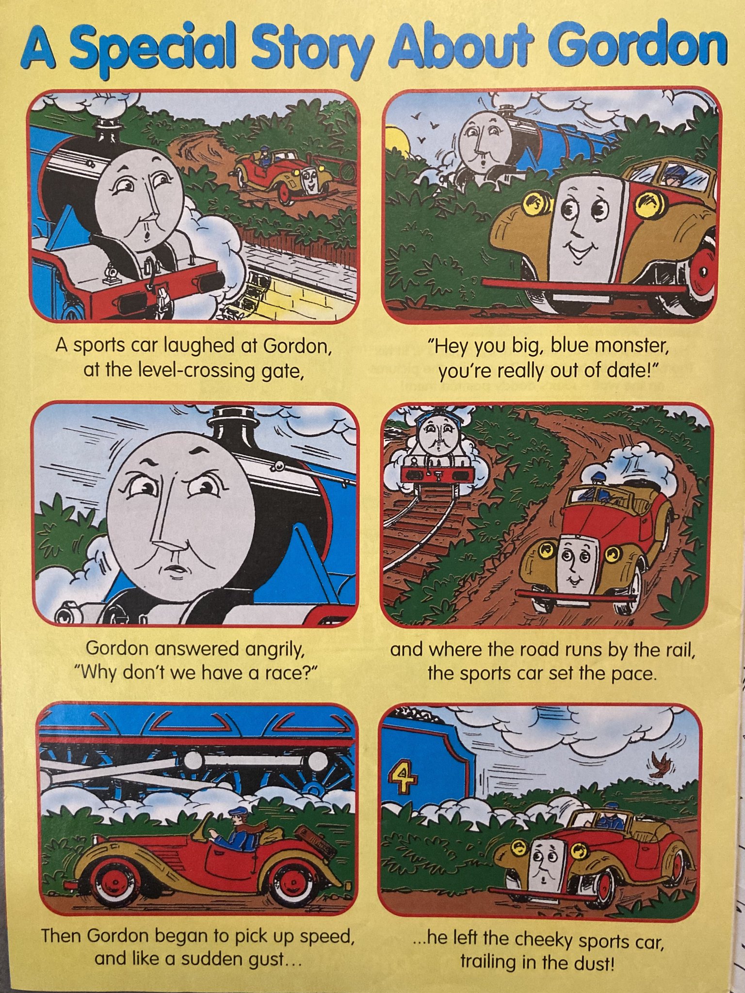 At a level crossing, a sports car laughs at Gordon and calls him out of date. Gordon then challenges the sports car to a race, and surprises it with his speed.