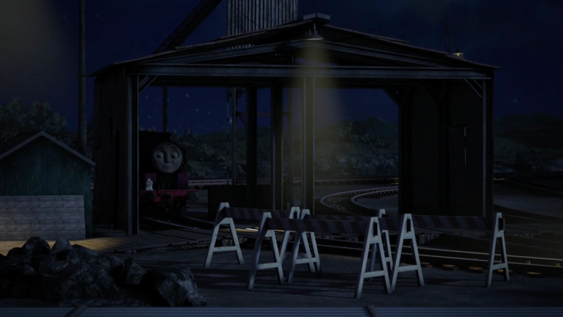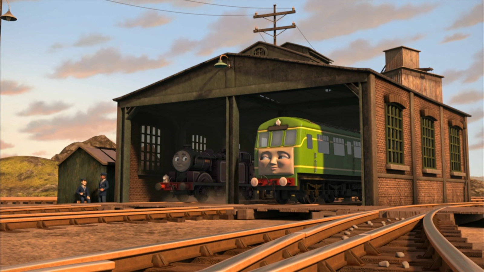 Following the completion of the line, the shed was rebuilt with brick walls, windows and a new tiled roof, while the surrounding yards were converted into a shunting yard. After being transferred from Thomas' Branch Line to carry out passenger services to Harwick, Daisy joined Ryan in the sheds.[2] Judy and Jerome were later moved to the sidings outside the shed to assist with rescue operations on the western side of Sodor.[3]