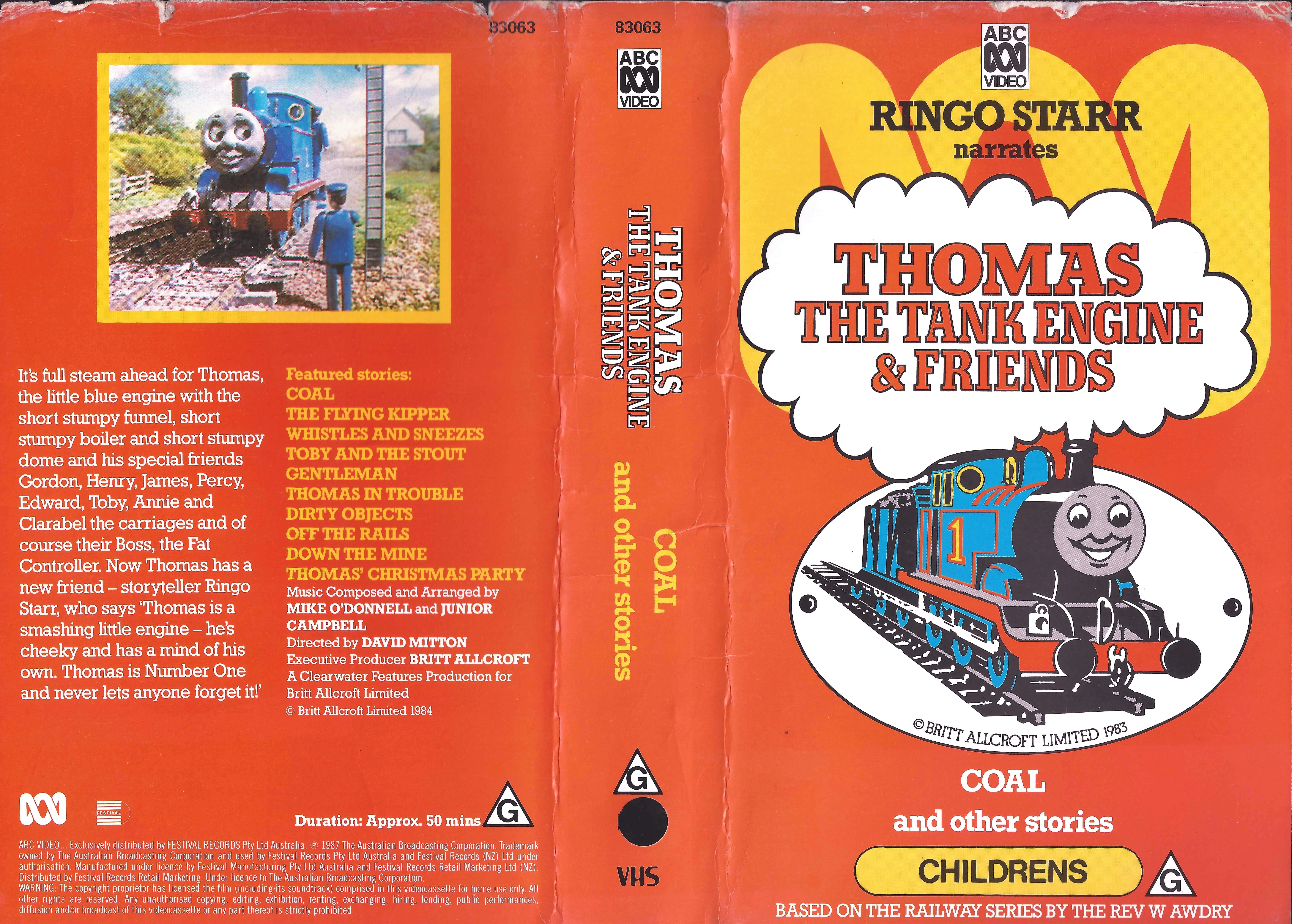 | It's full steam ahead for Thomas, the little blue engine with the short stumpy funnel, short stumpy boiler and short stumpy dome and his special friends Gordon, Henry, James, Percy, Edward, Toby, Annie and Clarabel the carriages and of course their Boss, the Fat Controller. His friend, storyteller Ringo Starr says 'Thomas is Number One and never lets anyone forget it!' | ||||