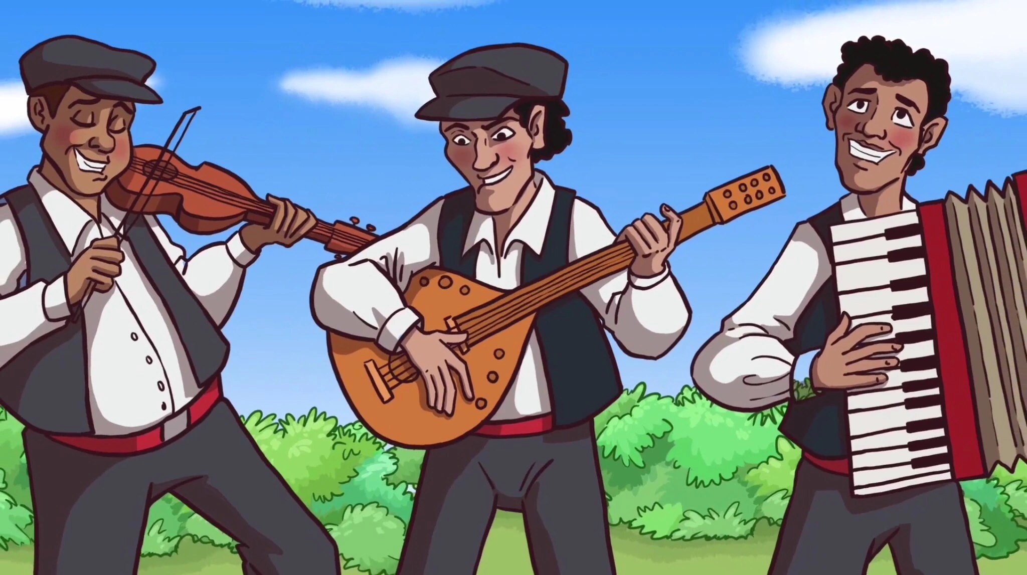 The uniform worn by the Batucada players consists of both white trousers and a shirt with a gold waistcoat and a green jacket over it. They wear white bowler hats with black bands around them.
