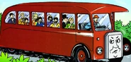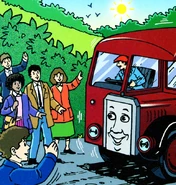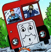 Later on, the driver asks if everyone is on board before departing Dingley Hall. One passenger jokingly asks where 'Bertie's Bumpy Ride' is going to take them next. This upsets Bertie who insists the bumps had not been his fault. The Fat Controller and Lady Hatt are also on board Bertie and they decide to eat their cream cakes. As Bertie sets off, he bluntly demands that there is no eating while on the bus. Bad-tempered Bertie then rolls onto the cobble road leading up to the castle, causing the Fat Controller to get cream on his nose. Fortunately, the Fat Controller can see the funny side and says that none of them will forget 'Bossy Bertie's Bumpy Ride' for a while.