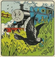 At the building site, Thomas sees one of the black birds swoop down and pick up something in the grass and fly off with it into a tree. Thomas gets closer to the bird which startles it and causes him to drop the item. The item is a nail! The foreman at the site explains that the bird is a jackdaw. Jackdaws like putting shiny things in their nests. Thomas concludes that some nails were missed and the jackdaws dropped them onto Bertie's road.
