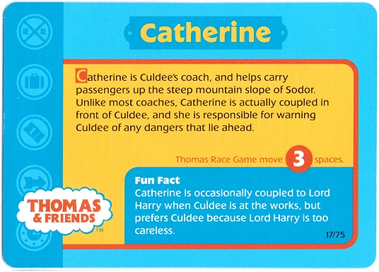 | “ | Catherine: Catherine is Culdee's coach, and helps carry passengers up the steep mountain slope of Sodor. Unlike most coaches, Catherine is actually coupled in front of Culdee, and she is responsible for warning Culdee of any dangers that lie ahead.