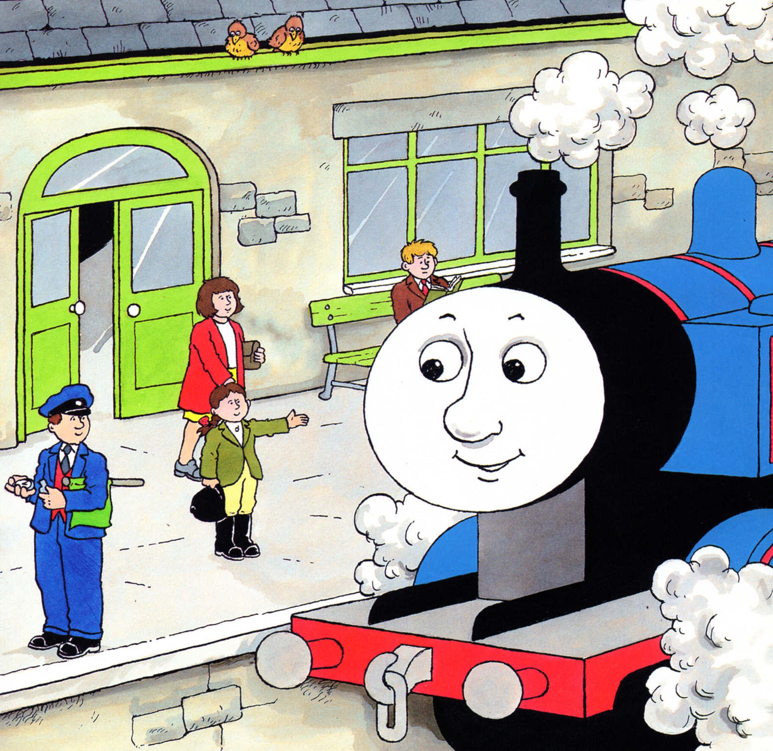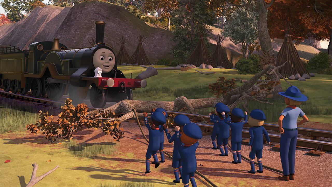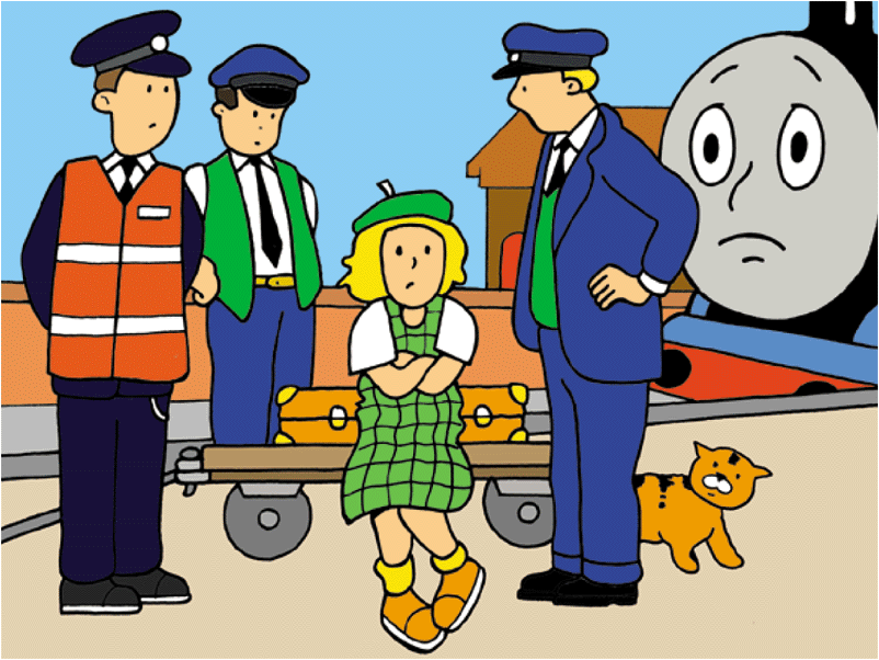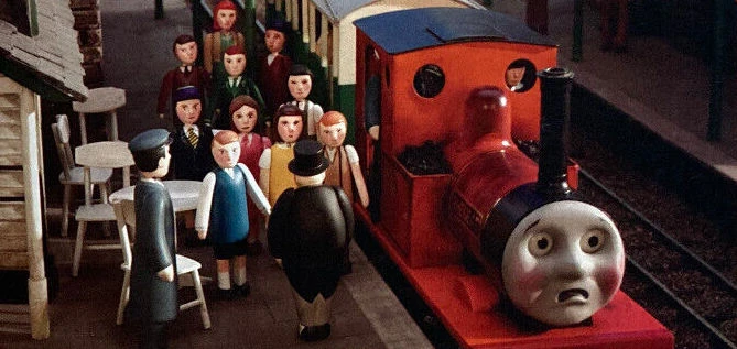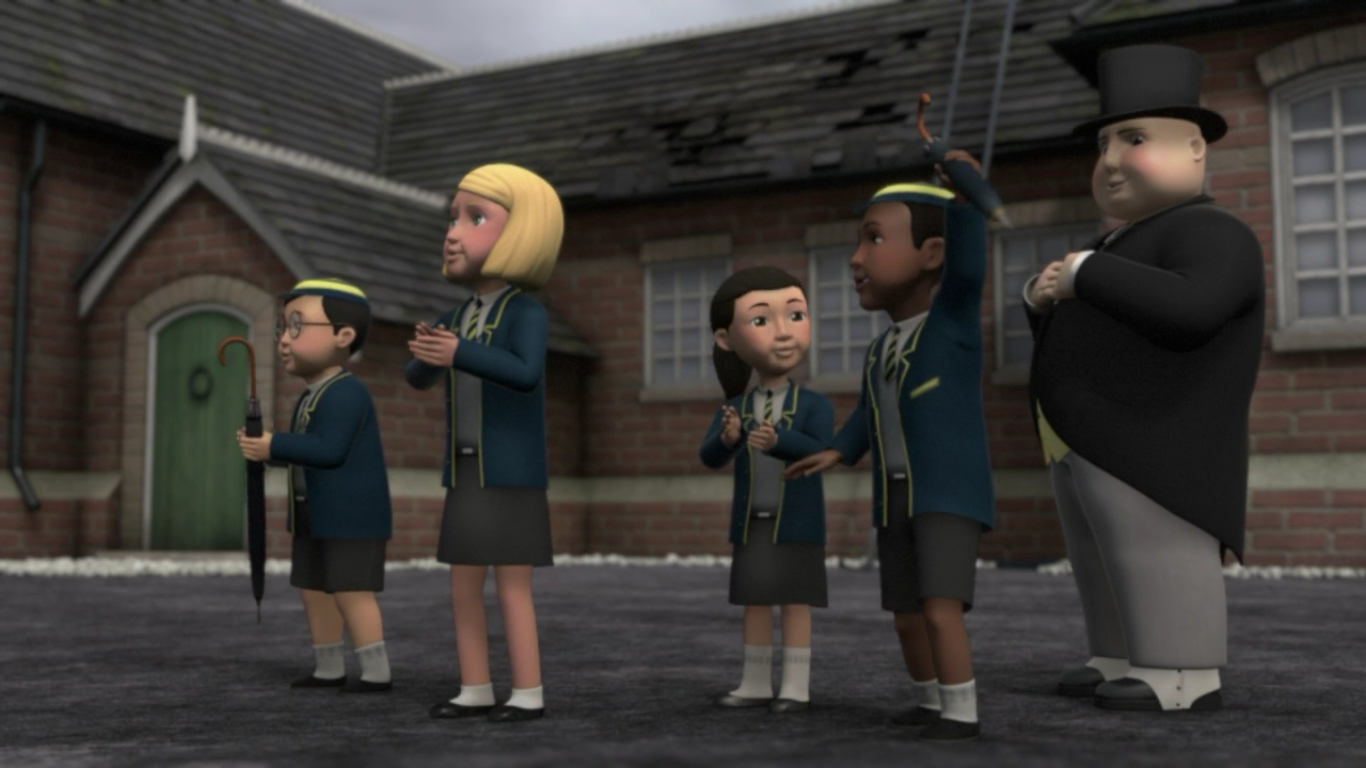 When James arrived at Knapford pushing Toby, a group of children were at the platform. One of them commented on the Express being late and thought that James required help from Toby. One day, a group of children were travelling home when their school bus broke down and then climbed onto a bridge to ask Thomas if he could take them home while he was pulling Annie and Clarabel.