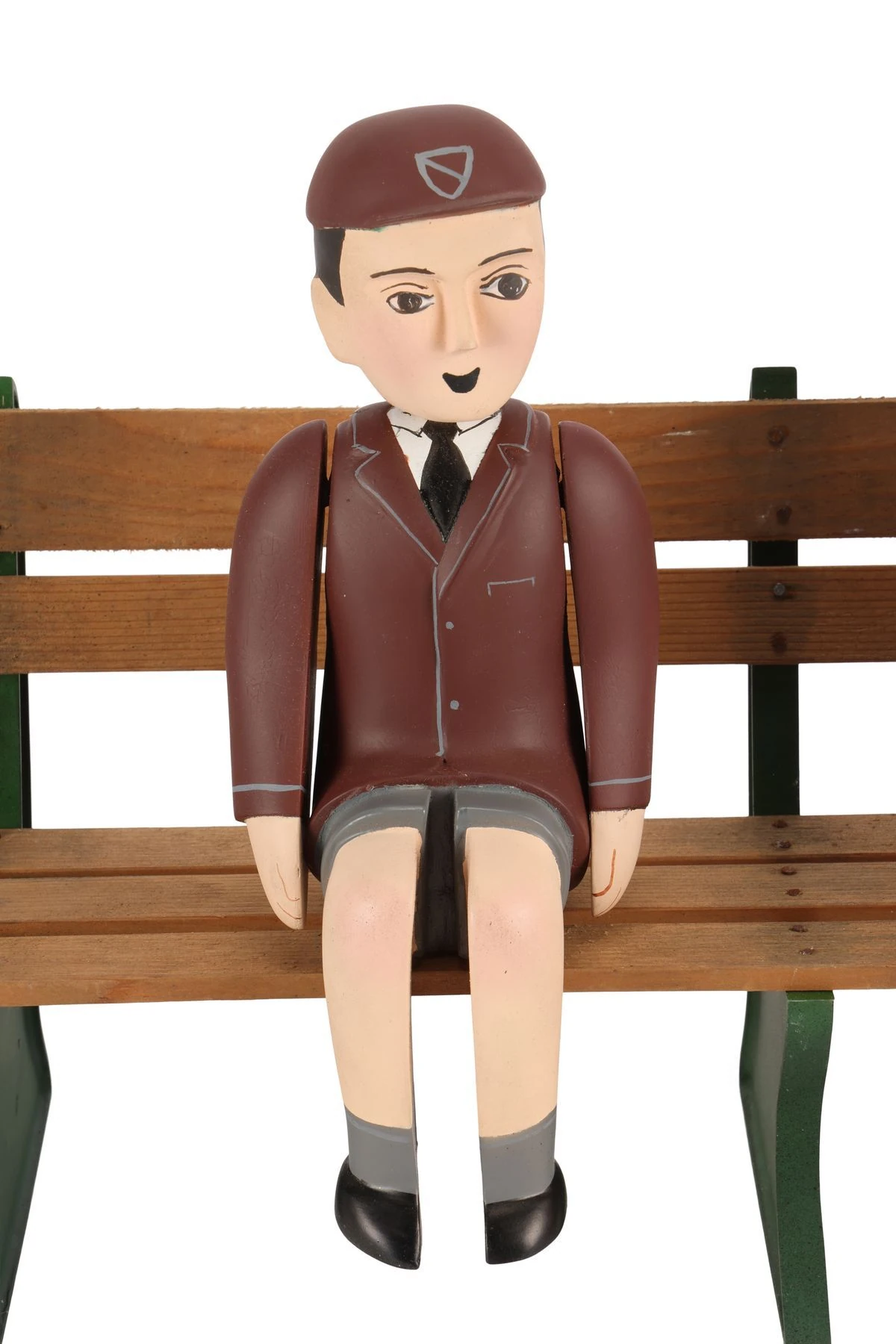 The boy wears a maroon jacket and matching cap with a white shirt and black tie and grey shorts.