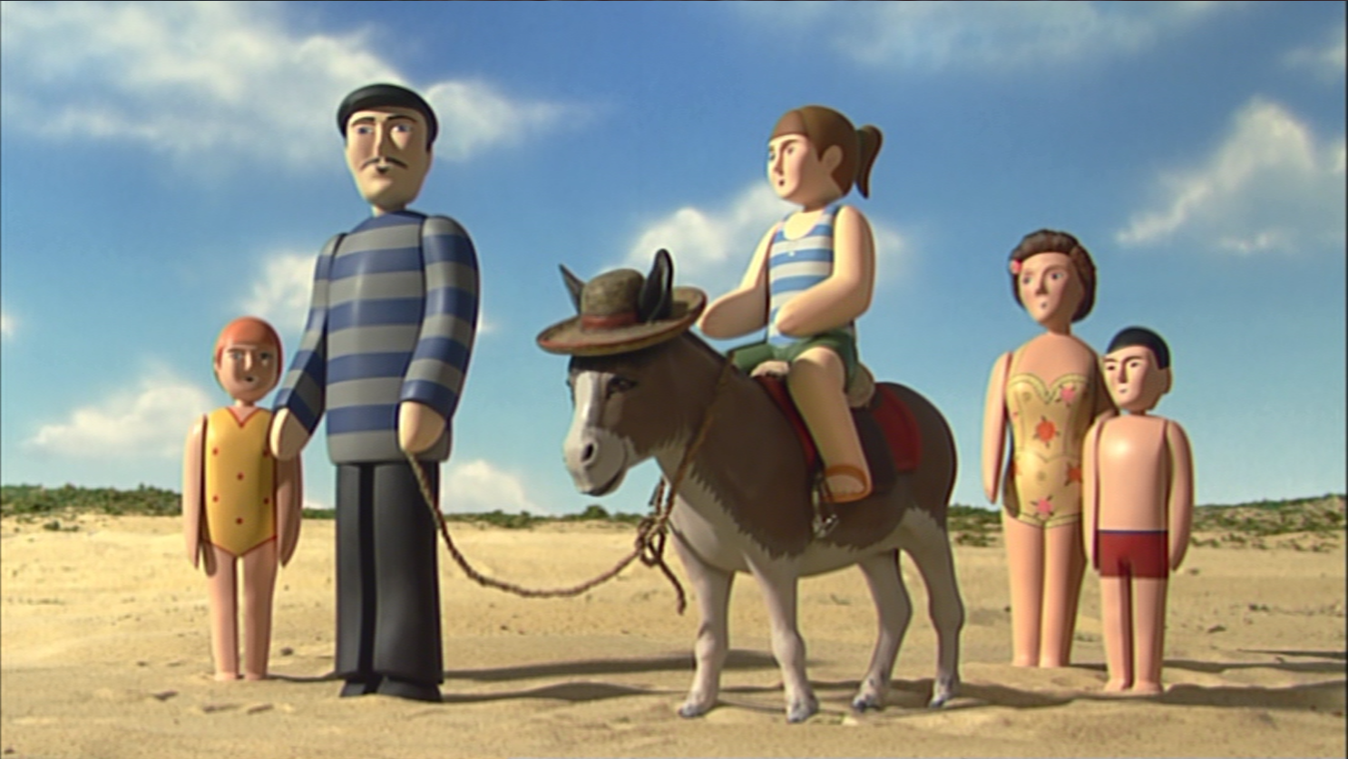 The Donkey Riding Girl is a little girl with brown hair.