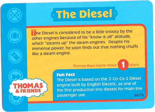 | “ | The Diesel: Like all diesels, The Diesel thinks he knows it all. He thinks all Steamies should be replaced by Diesels. Despite his immense power, he finds out that even diesels need help!