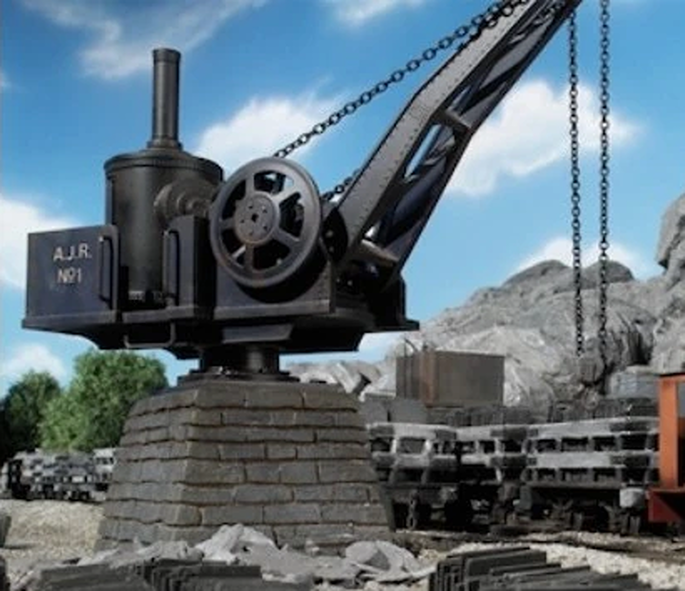 A.J.R No. 1 is a stationary steam-powered crane used by the Skarloey Railway.