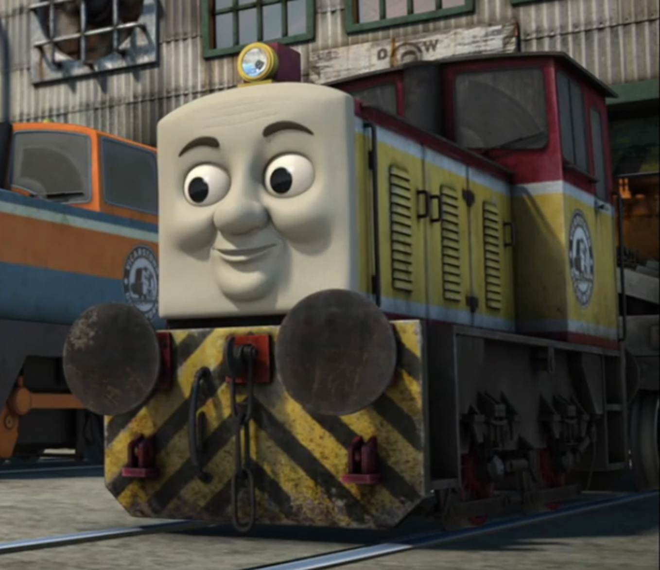 Dart works at the Vicarstown Dieselworks supporting and assisting Den. The two have worked together for so long that Dart can often guess what Den is thinking before he can get it out himself. Although not so much the thinker of the duo, he is usually the doer and can be the chattier of the two. He quickly buzzes about the Dieselworks, occasionally bashing, crashing and clanging into things. He can be heard to grumble "Dizzy Diesels!" when something goes wrong. Dart is very able in his work and a valuable team player. Despite being small in size, he is feisty and fast. Dart also likes jokes, sometimes to the annoyance of the other Diesels. If feeling bothered (particularly by the steam engines), Dart is far from devious, but can get grumpy, gruff, irritable, cantankerous and sometimes cheeky too, even going as far as to keeping Thomas and Kevin trapped in the Dieselworks' back sheds, but otherwise he is the quick-witted assistant of the Dieselworks.