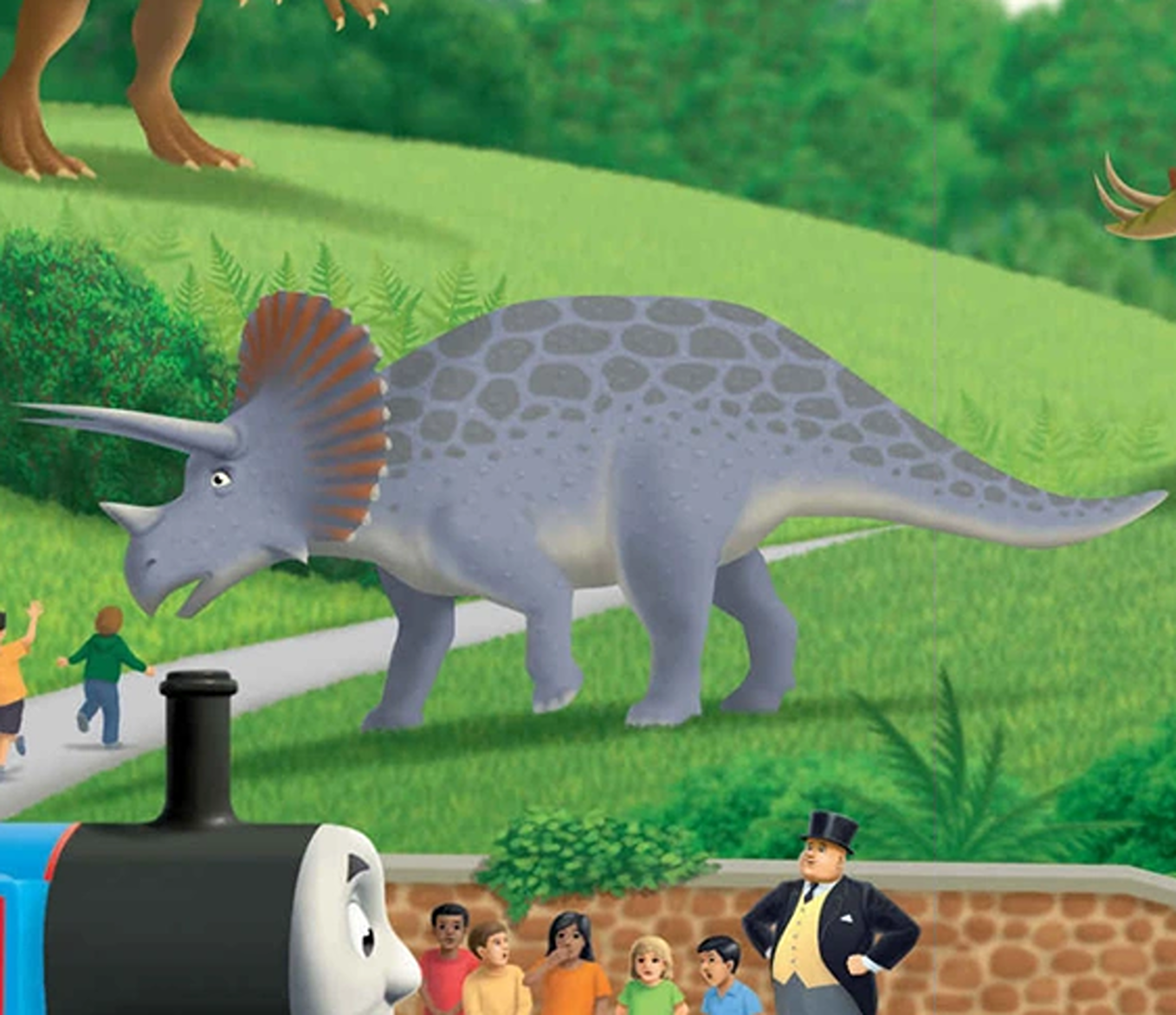 While digging the swimming pool for a new school, Oliver discovered a Triceratops skeleton and he got his picture taken on the front page of the Sodor Times. In Thomas and the Dinosaurs, Thomas delivered a model of a Triceratops to the Dinosaur Park.