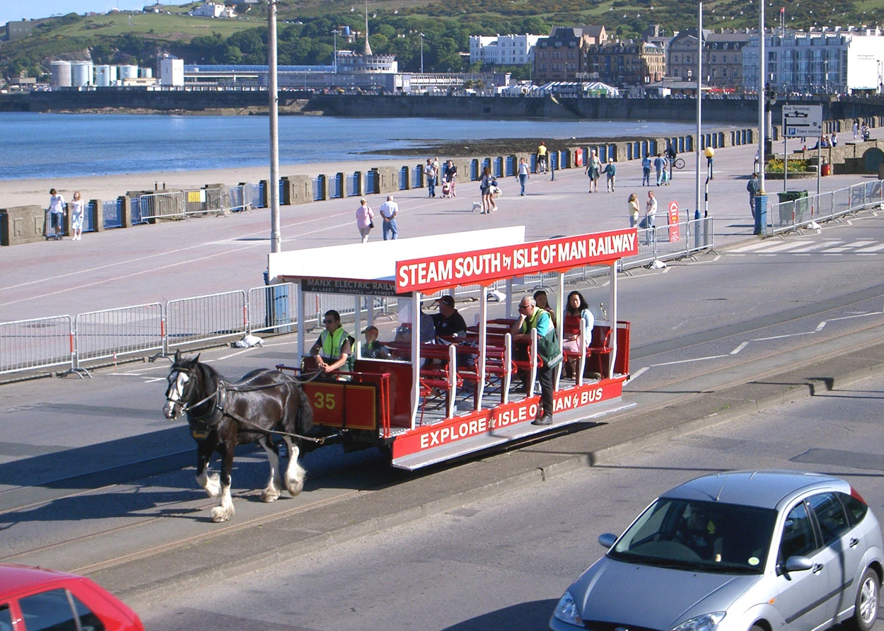 The Douglas Bay Horse Tramway on the Isle of Man which runs along the seafront promenade for approximately 1.6 miles (2.6 km), from the southern terminus at the Victoria Pier, adjacent to the Sea Terminal, to Derby Castle, the southern terminus of the Manx Electric Railway, where the workshops and sheds are located.