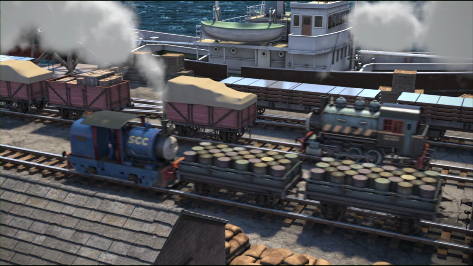 - Percy, James and the Fruitful Day - An extended scene of cargo being unloaded at the harbour.