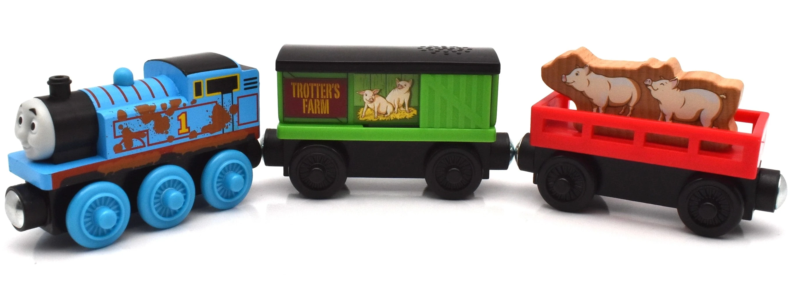 Later, Thomas is transporting some pigs to Farmer Trotter's pig farm and spots the photographer about to take a photograph of Percy. Thomas speeds up and blocks Percy out of the photograph. Percy is surprised and swerves into a siding and ends up in a big pile of coal. Thomas carries on, unaware of Percy's accident. On his way to the farm, Thomas passes through Maron as Gordon thunders past with the express. Thomas is sure that Gordon will not have been in a photograph yet and decides to find the photographer to have another photo taken. At a junction, the photographer is waiting to take a photograph of James. Thomas wants to be in James' photograph and speeds up, resulting in Thomas blocking James out of the photo. James is surprised and veers into a siding, destroying a set of buffers and derailing. Thomas is so busy feeling pleased with himself, he does not notice James' derailment.