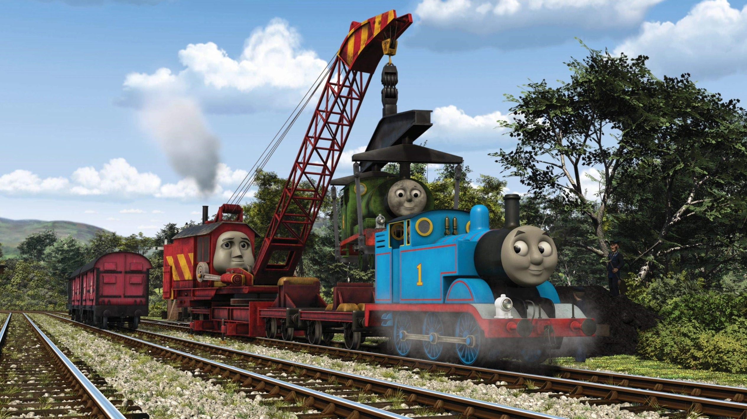 At the docks, Thomas picks up the camera and heads back to the photographer. On the way back, Thomas sees Percy in the heap of coal. Thomas promises to come back and help his friend after he has delivered the camera. Next, he meets James and promises to rescue him as well. At the bridge, the spare camera is handed to the photographer, who thanks Thomas before the little engine sets off to help his friends. He finds Rocky, who is being pushed to the docks by Edward. Thomas asks if Rocky can help him, which Rocky is pleased with and the two set off to rescue James. Rocky lifts James back onto the rails and races away with Thomas to help Percy. Soon, a grateful Percy is back on the rails too.