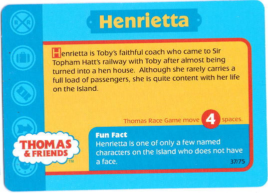| “ | Henrietta: Henrietta is Toby's faithful coach. She came to Sir Topham Hatt's railway with Toby after almost being turned into a hen house. Although she rarely carries many passengers, she is quite content with her life on the Island. Henrietta is the only named character on the Island who does not have a face.