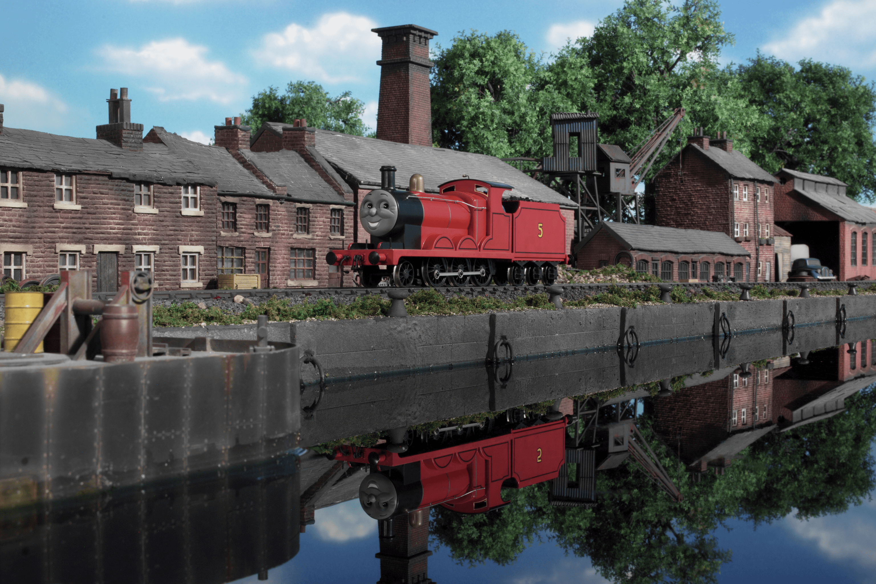 The next morning, all the engines are busy - Percy is at the coaling plant, Thomas and Emily are working together to take passengers up and down the branch lines and Gordon is pulling the express. The Fat Controller sends James to the coaling plant to help Percy fill and deliver an important order of coal to the docks. However, James ignores the Fat Controller's orders and puffs along a canal to see his reflection and goes to various stations and branch lines so that people can see him. However, when he arrives, everybody keeps leaving, which makes him cross. Thomas - seeing James on his branch line - reminds him that he should be working, but James takes no notice when he passes Henry by showing him his shiny red paint work.