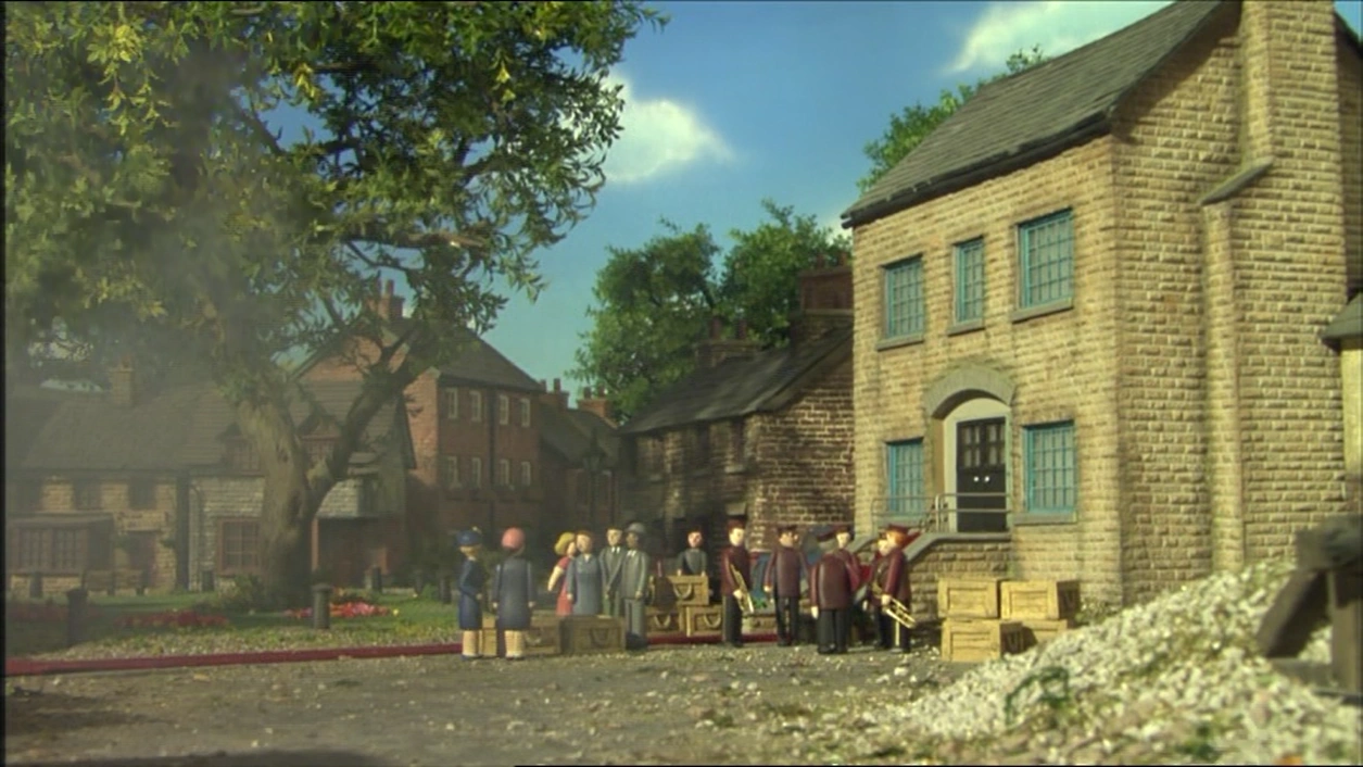 Sir Topham Hatt, the Mayor, and the Storyteller at the grand opening of the library at Abbey