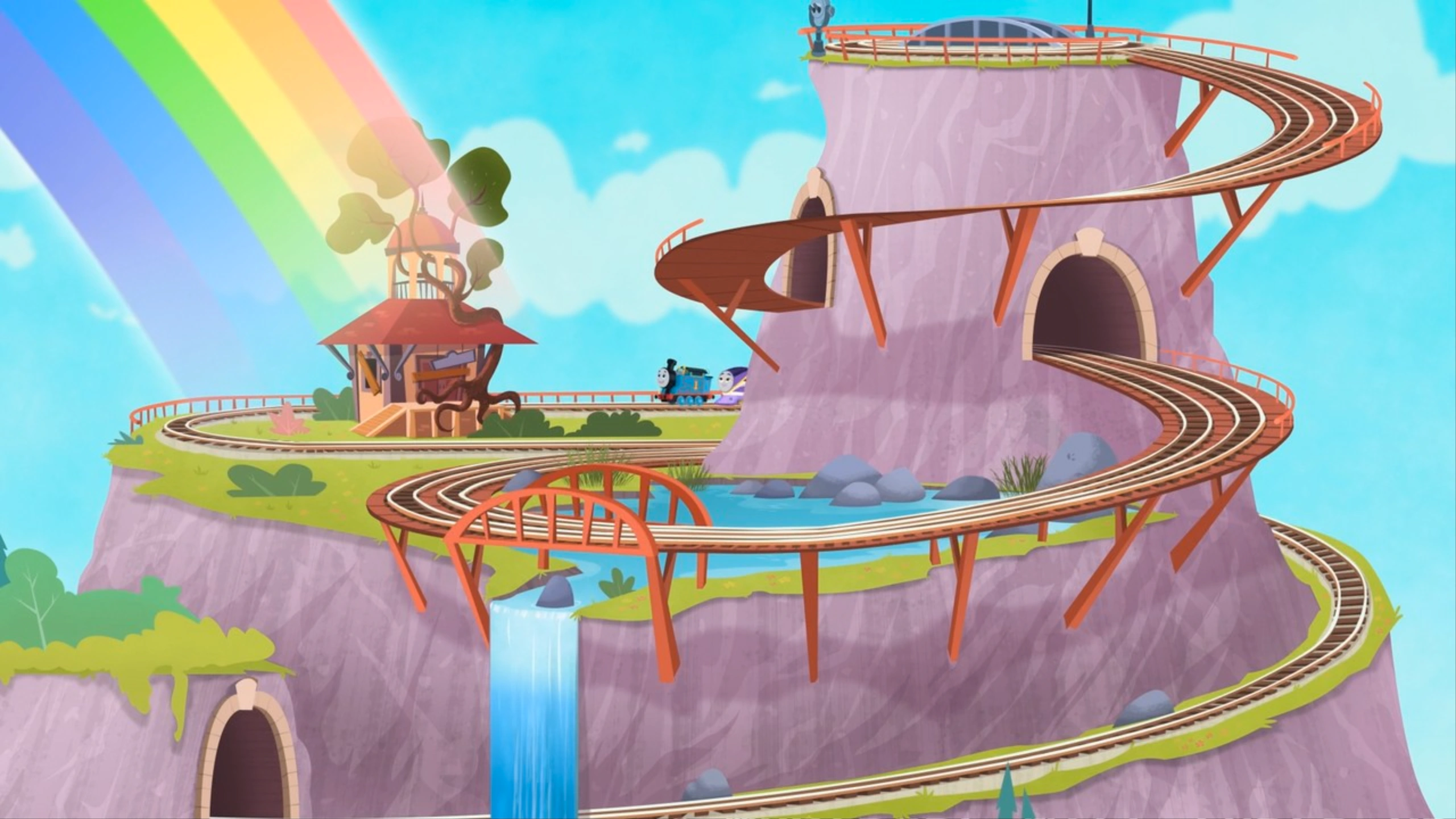 One day, Thomas and Kana were chasing after a rainbow, wanting to know what was waiting at the other end. Along the way, they ran into all of their friends. Soon, they found the rainbow's end which was located at the top of the mountain. After discovering the mountain, they all agreed to make it their clubhouse and called it Lookout Mountain.[2]