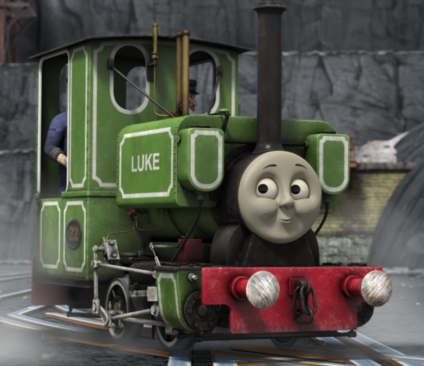 Luke is a plucky little pea-green tank engine on the Skarloey Railway, brought to Sodor from a neighbouring land. For a long time, he hid in fear and deep shame in the tunnels and caverns of the Blue Mountain Quarry from a terrible, dark secret, only in the knowledge of the other narrow gauge engines, believing that he had caused a Yellow Engine to fall into the sea. Fortunately, he befriended and trusted Thomas, who investigated and realised the yellow engine was Victor and that the accident had not been Luke's fault, managing to clear his name. Luke is a gentle, sensitive soul and is bubbling with enthusiasm, keen to work as part of the team. Like many engines, there are times when he may want to run away and be left alone and he may not be quick to stick up for himself either, but when there is someone in need, Luke is passionate about showing how much he values his friends and will bravely heave into action without a second thought.