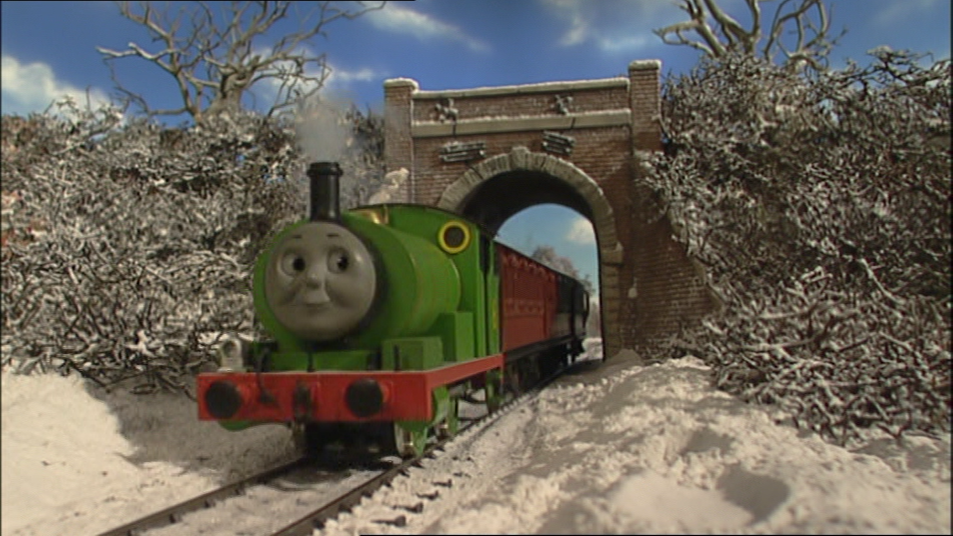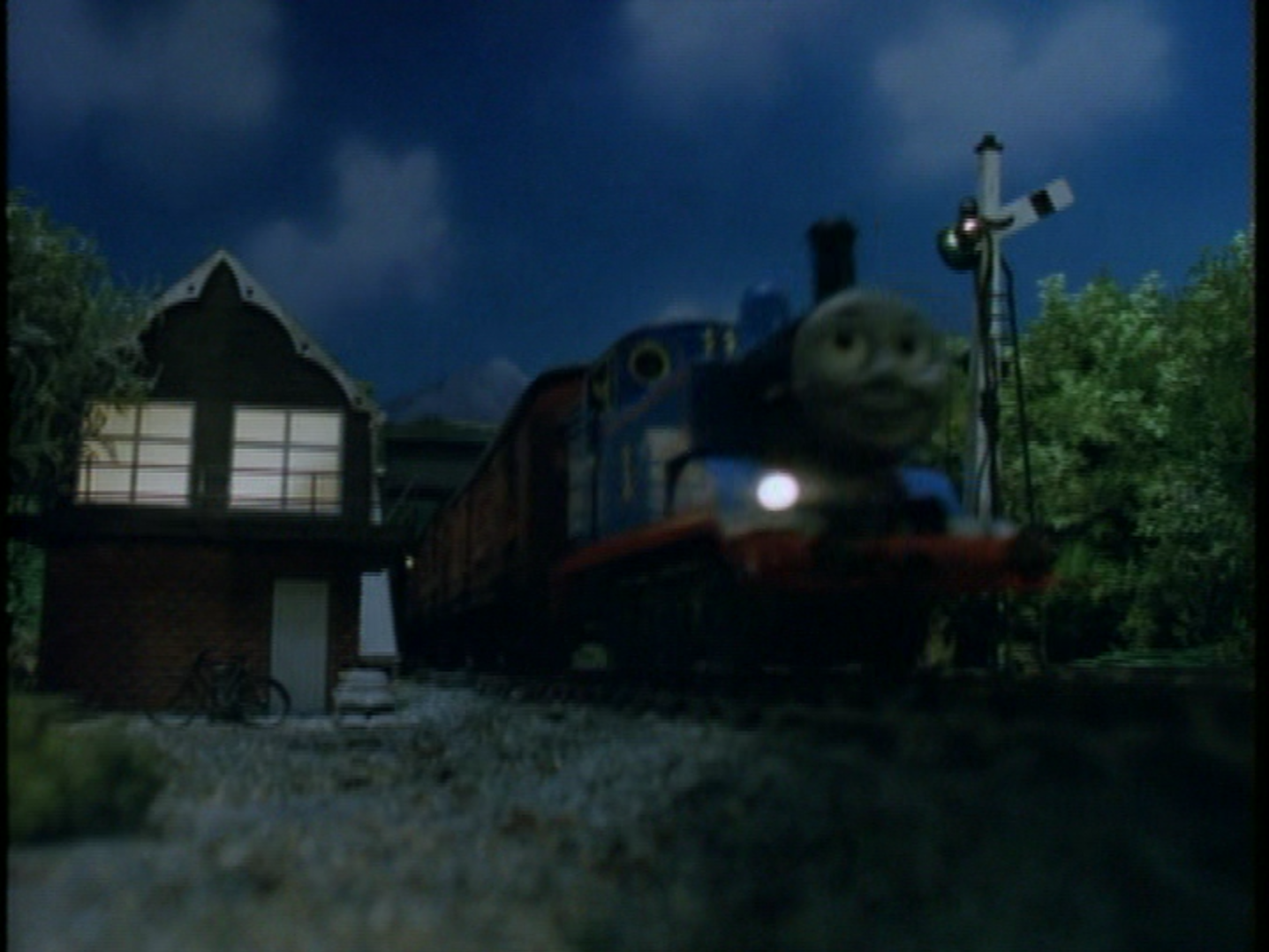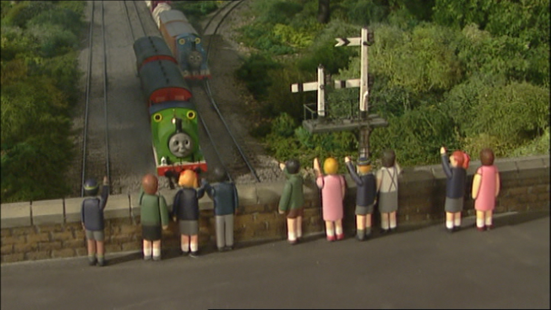 Once, whilst trying to get his photograph taken, Thomas overtook Percy by the signal box, surprising the latter and causing him to run into a pile of coal at the end of the siding. Thomas later came back to lift him out with Rocky.