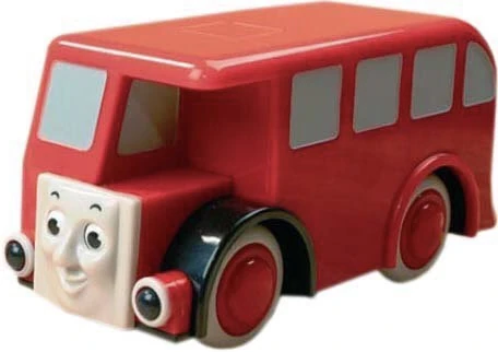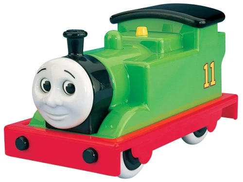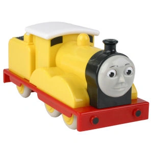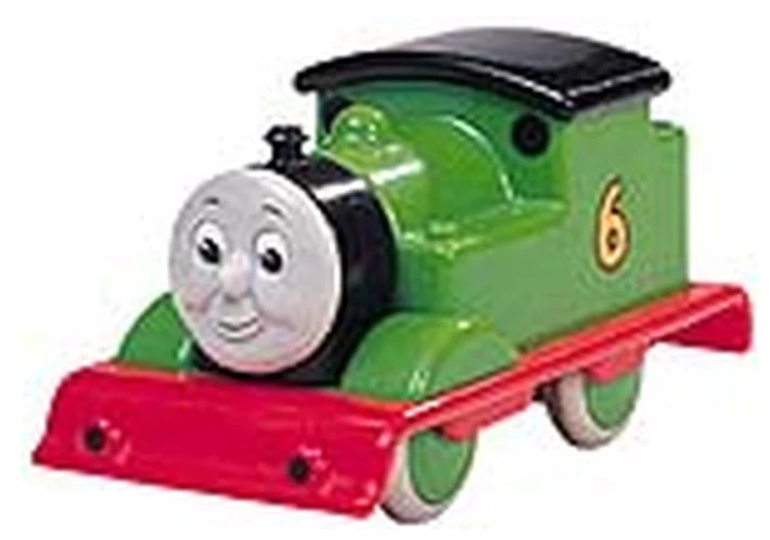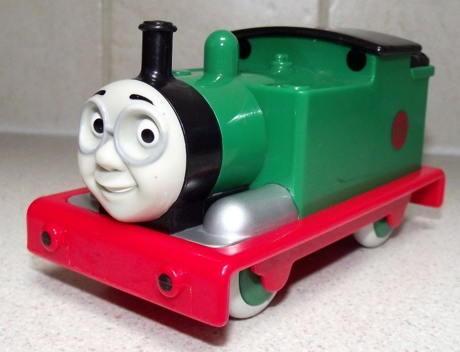 The talking My First Thomas range was first released in 2000. These toys were more complex than the push along range, with moving eyes and several phrases. The interactive versions had the ability to talk to each other when facing each other and communicated using small sensors hidden in a semi-transparent buffer on one side (Bertie and Harold had the sensors in a headlight and a float respectively). The talking only versions had fully painted buffers without the sensors (which were indicated by a small purple LED light). Unlike the interactive versions, the talking only ones also had on/off switches.