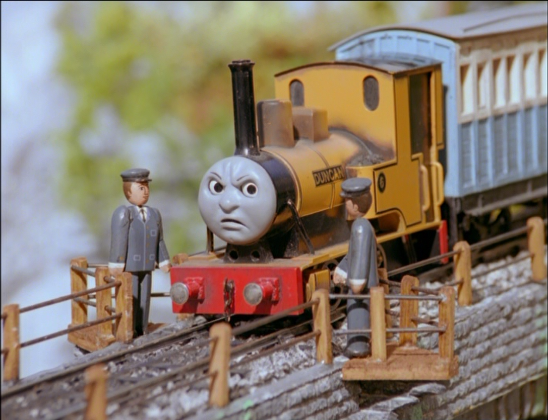 | Duncan complains about not getting polished. His rudeness reaches its peak when he stops on the viaduct and refuses to move. | |||