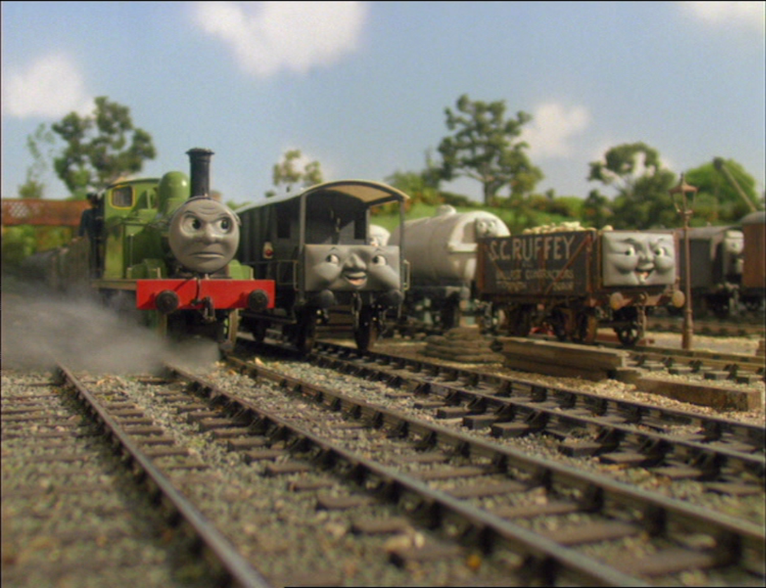 | Sir Handel is pushed off the rails by some angry coaches. A red narrow gauge engine named Skarloey is the only engine available and is determined to get his passengers home, even when one of his front springs breaks. | |||