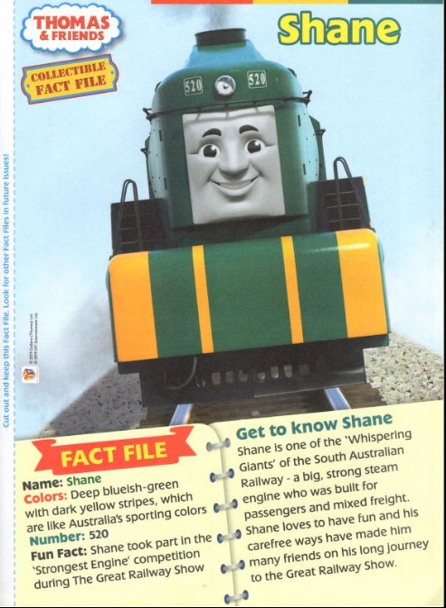 Shane is based on the South Australian Railways (SAR) 520 class. The real engine carrying his number, Sir Malcolm Barclay-Harvey, is currently awaiting funding to continue restoration by the SteamRanger Heritage Railway at their workshops in Mount Barker, South Australia.