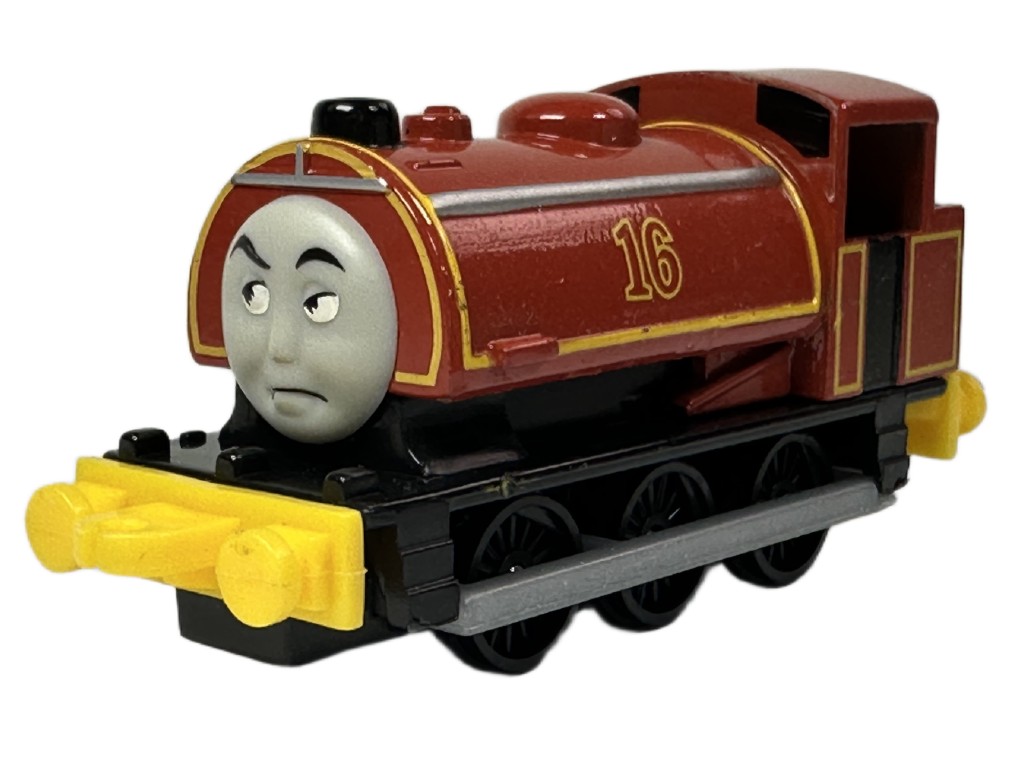 Sixteen is painted orange-brown with yellow lining. His number (16) that he is named after is painted on the sides of his saddle tank in brown with a yellow border. His buffer beams are painted with yellow and black hazard stripes and his buffers are painted silver. His paint is chipped in places.