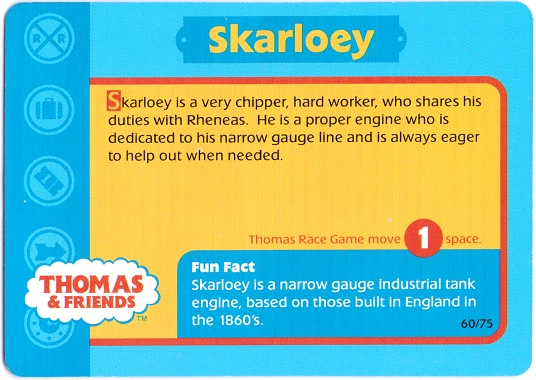 | “ | Skarloey: Skarloey is a very chipper, hard worker, who shares his duties with Rheneas. He is a proper engine who is dedicated to his narrow gauge line and is always eager to help out when needed.