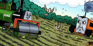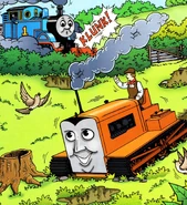 One day, Thomas is shunting trucks on his branch line when he spots Terence ploughing in a rather wet field. Thomas is so busy watching Terence that he runs into some buffers which causes his fireman to drop his shovel. After it slips down the embankment next to the tracks and onto the road, he isn't given much of a chance to pick it up when George the grumpy steamroller rumbles over it - making it as flat as a pancake!