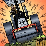 Later, George has to wait as a broken water main has flooded the road. George is too impatient and decides to take a shortcut through Terence's field. Unfortunately, George cannot grip the mud like Terence can and he slips and slides across the field and hits a tree trunk in the corner that not even his roller can squash. Soon, Terence tows George out of the field and to Thomas, who is waiting to transport George to his roadworks. Both Thomas and Terence boast about their usefulness and, for once, George decides to keep quiet!