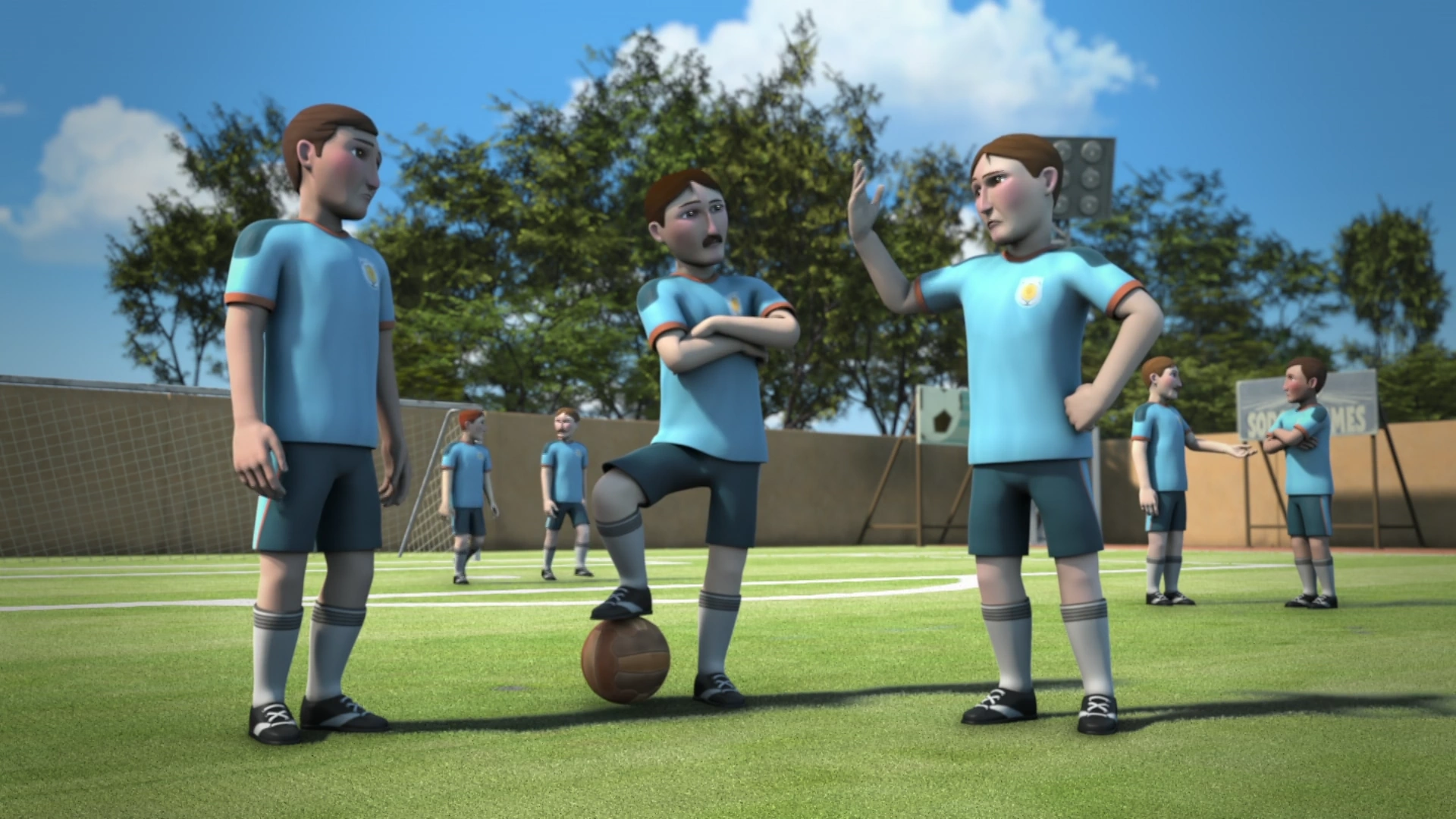 The uniform worn by the footballers consists of dark teal trousers and a light blue shirt with orange lining over it. They have the logo of the Sodor United Football Team on the front of their shirts.