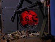 The eye mechanism had two servos, one for up and down movement and one for left and right movement. The up/down servo was attached to the body. The left/right servo had a rod attached to the arm, which connected to a bracket. The eye balls were coupled to the bracket and locked in by the face-plate, so whenever the servos were powered, the eye balls would move however the crew member desired.