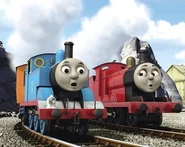 At the quarry, the Composer is puzzled; there are no sounds at the quarry at all. Then, with a loud whistle, James arrives. Thomas is annoyed and puffs away, but James follows him blowing his whistle loudly. Then, there is trouble. Thomas puffs towards some fallen stones and has to brake hard. His coaches stop with a bump and the Great Composer's sheets of music fly out of the carriage windows and blow away. Thomas feels terrible, but is puzzled by how the Composer was able to write any music at all with his noisy friends disturbing the sounds of Sodor. The Great Composer explains that Thomas' noisy friends are the sounds of Sodor and now he will not have a tune for the concert. Thomas has an idea and puffs away to find his friends.