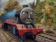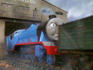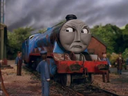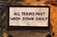 (Note: Gordon's eyebrows are missing) The "All trains must wash down daily" sign