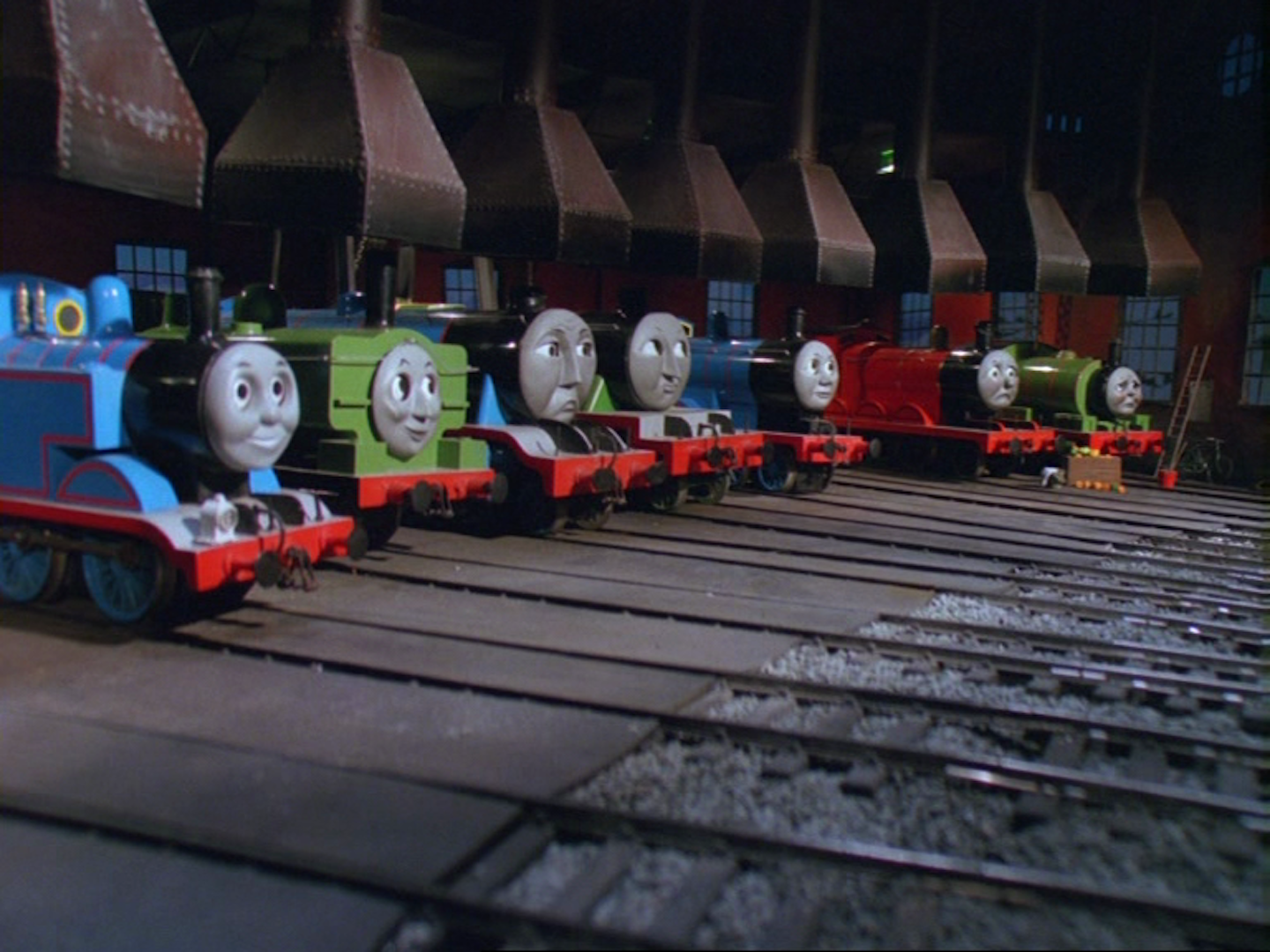 - In several episodes of the seventeenth series: the three big engines (Henry, Gordon and James) at the right side of the shed in a random order, Thomas and Percy in the middle and Emily and Edward at the left side of the shed.