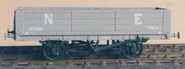 The NBR Diagram 43 Tube Wagon is painted dark grey. It has the letters "N E" (standing for "North Eastern", a shortened abbreviation for the London and North Eastern Railway) as well as the words "TUBE WAGON" along the top plank and its weight (10 TONS) on the bottom plank, all written in white lettering.
